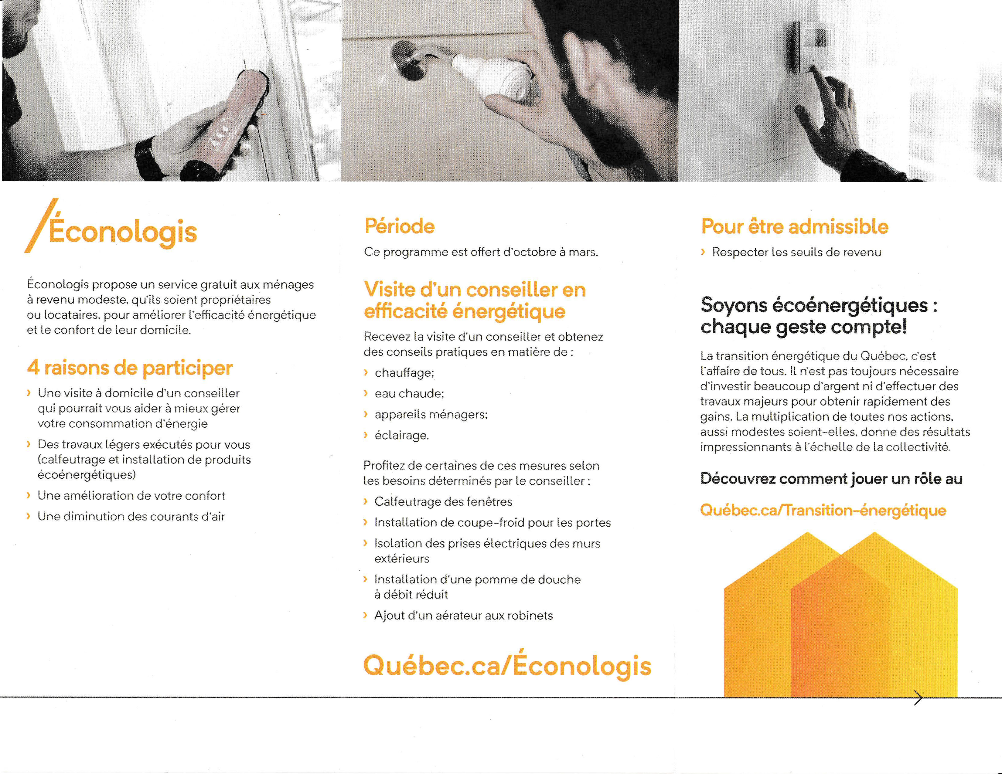 Le programme ECONOLOGIS, du ministère de l'Environnement, de la Lutte contre les changements climatiques, de la Faune et des Parcs du gouvernement du Québec, est de retour cette année. Ce programme donne l'opportunité aux citoyens de profiter gratuitement de conseils et d'interventions visant à améliorer l'efficacité énergétique de leur logement.