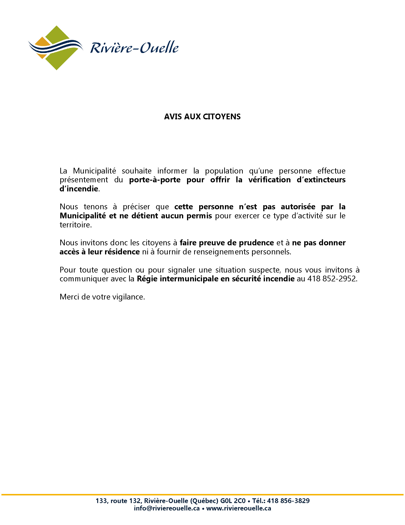La Municipalité souhaite informer la population qu'une personne effectue présentement du porte-à-porte pour offrir la vérification d'extincteurs d'incendie.