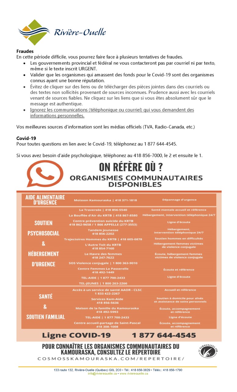 Particulièrement pendant cette période mouvementée, votre municipalité se préoccupe de savoir comment, individuellement et collectivement, vous passez au travers et comment nous pouvons vous aider. Soyez assuré que l'équipe municipale demeurera disponible pour répondre à vos inquiétudes et interrogations.