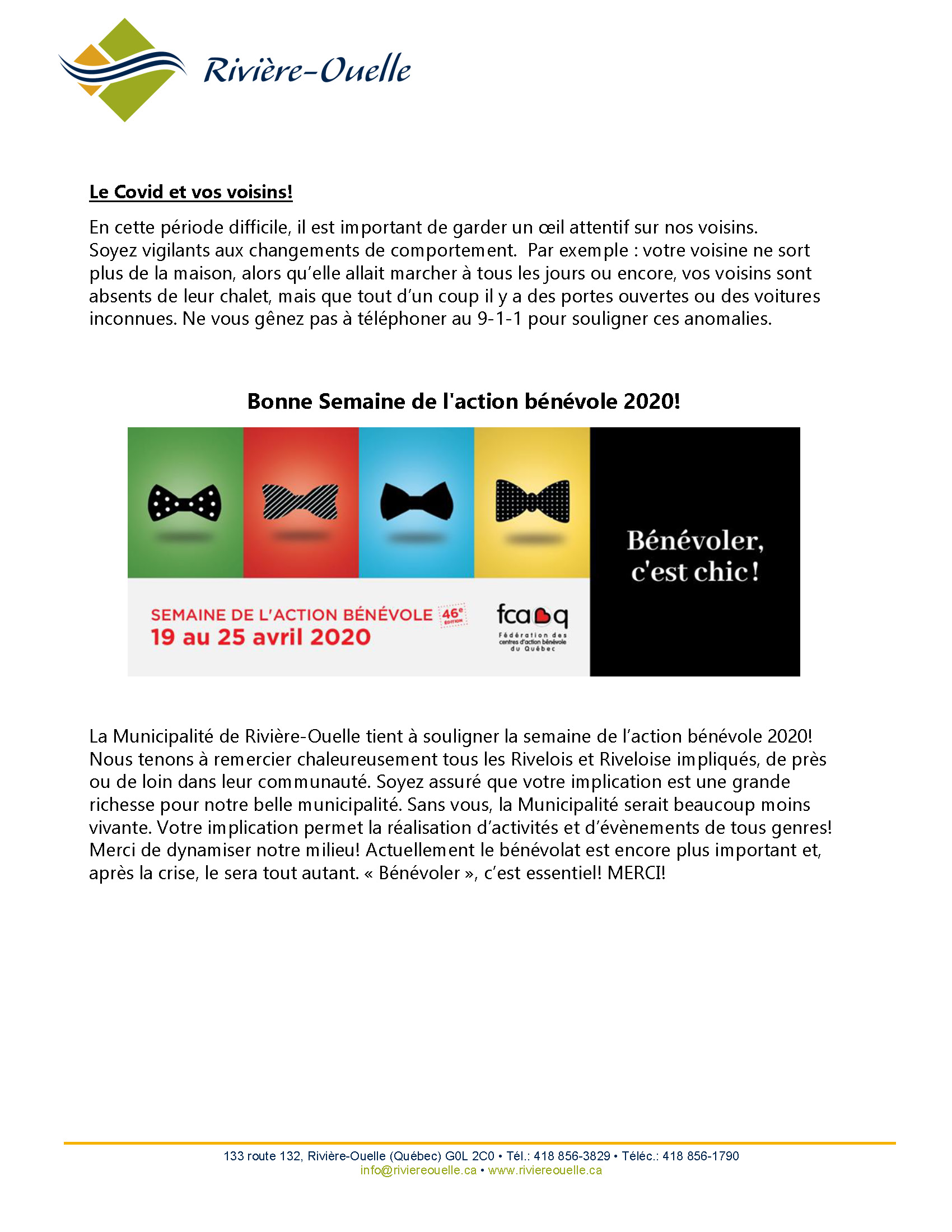 MUNICIPALITÉ DE RIVIÈRE-OUELLE - LE 23 AVRIL 2020