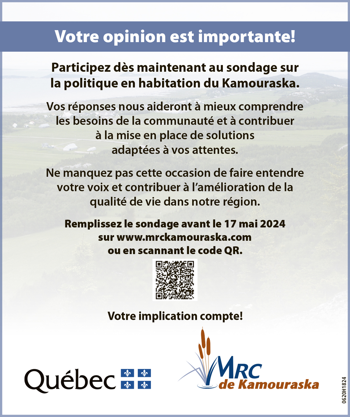 Saint-Pascal, 22 avril 2024- Afin de créer une politique de l'habitation qui réponde adéquatement aux besoins des Kamouraskois et Kamouraskoises, leur opinion et leurs observations sont sollicitées par le biais d'un sondage à remplir d'ici le 17 mai 2024.