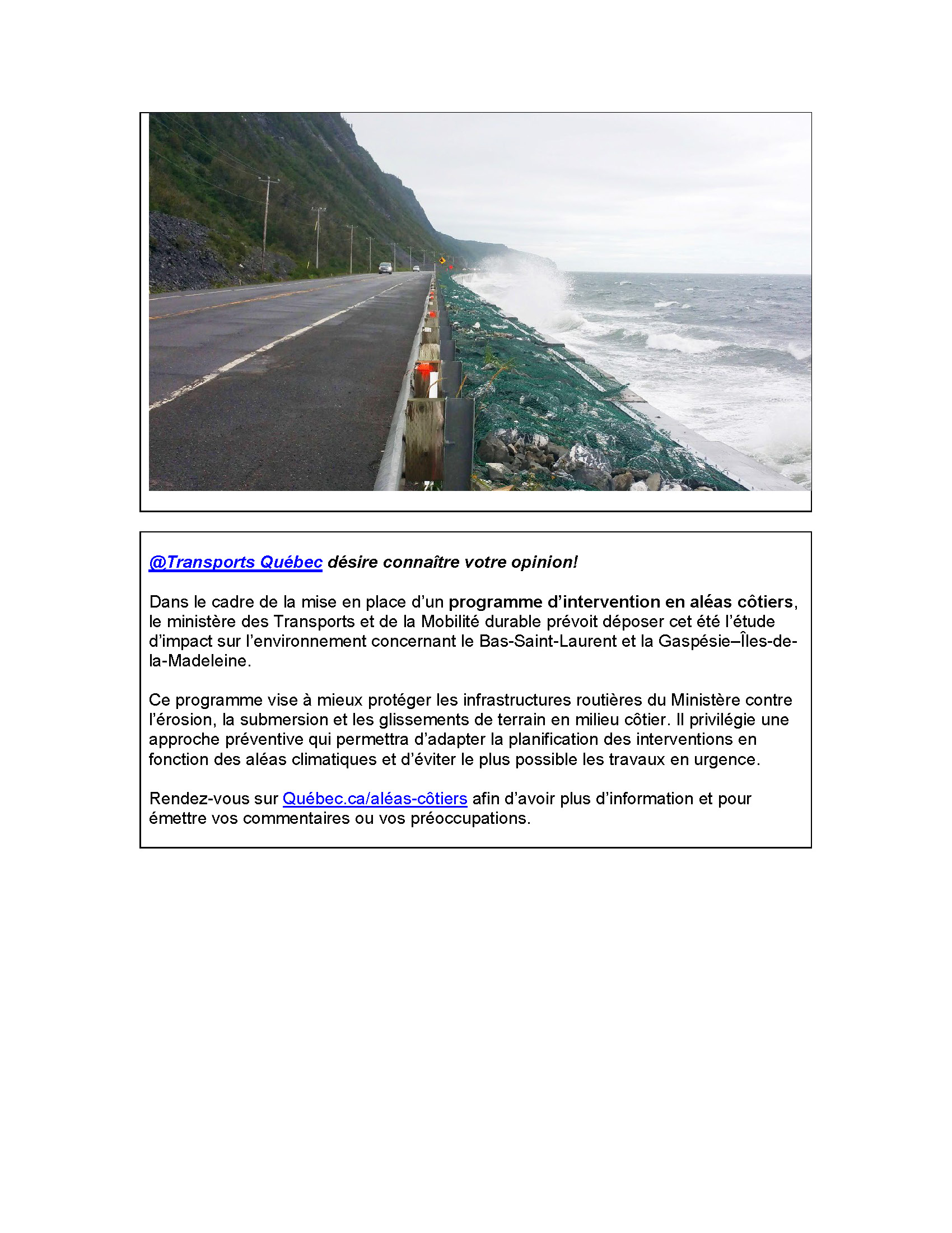 Rendez-vous sur Québec.ca/aléas-côtiers afin d'avoir plus d'information et pour émettre vos commentaires ou vos préoccupations.
