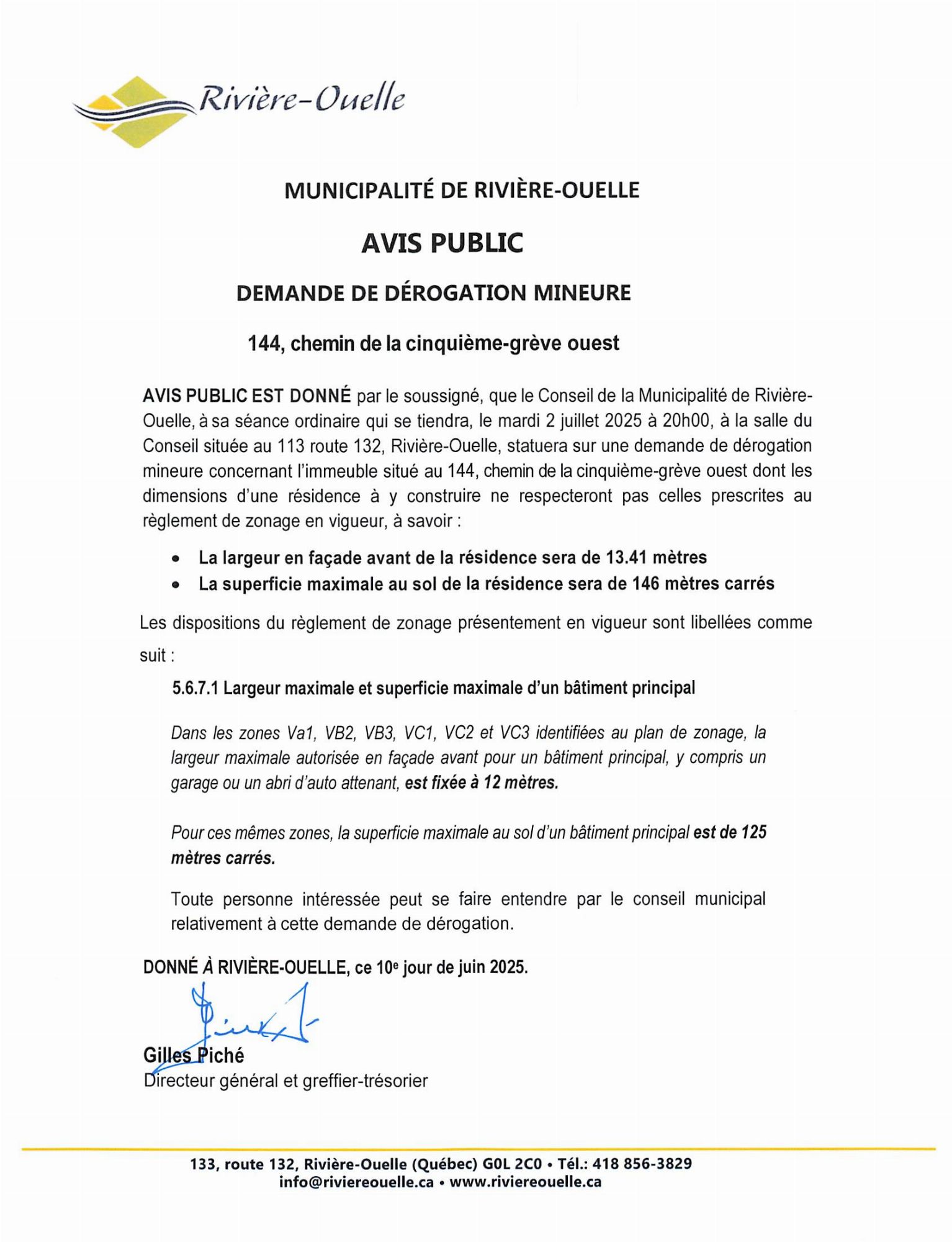 Avis public concernant l'adoption du Règlement 2025-10 établissant un programme d'aide sous forme de crédit de taxes foncières dans la zone résidentielle « 41R et une partie de 44M »