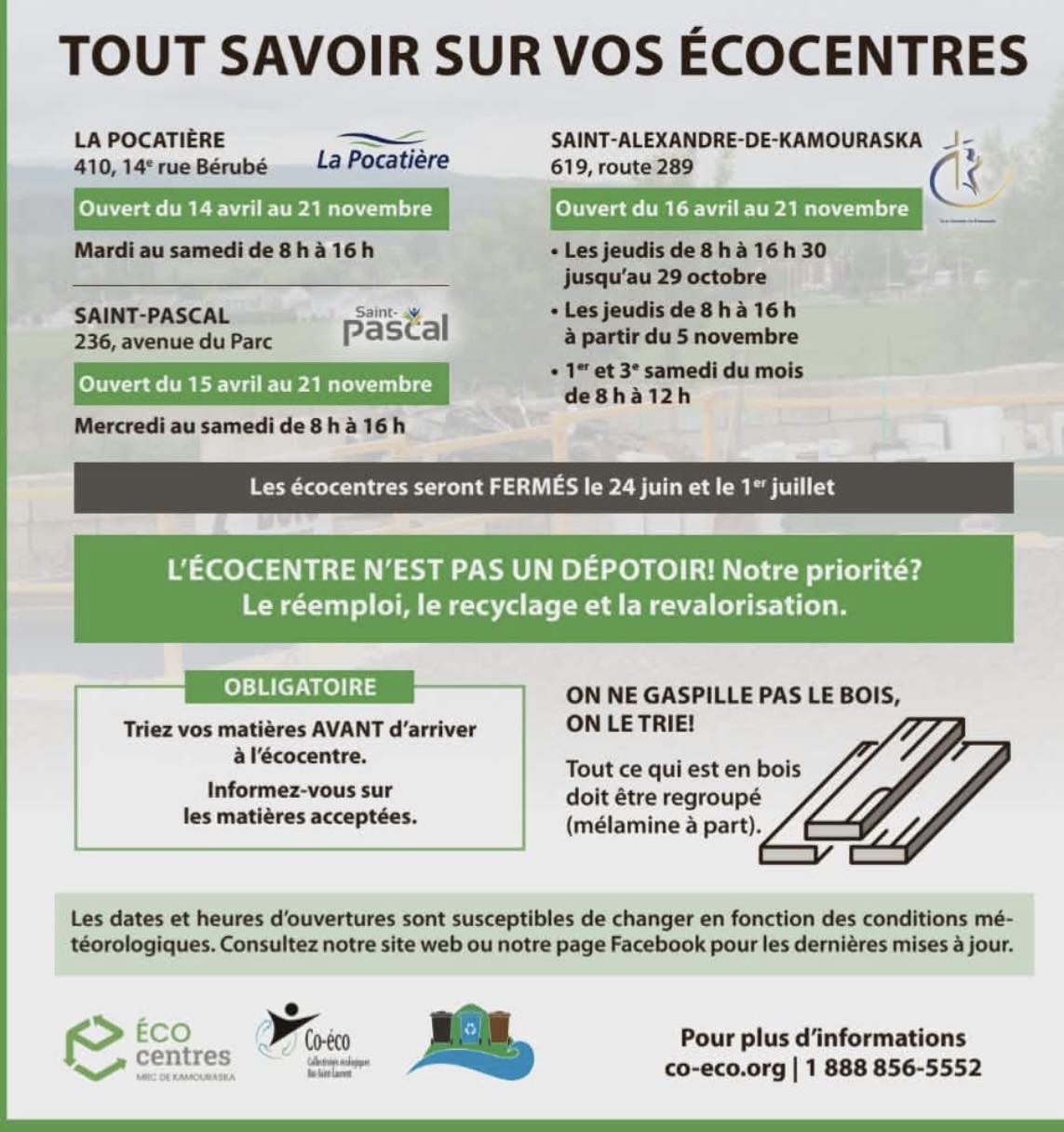 Nous vous invitons à consulter les heures d'ouverture des écocentres afin de planifier vos visites.